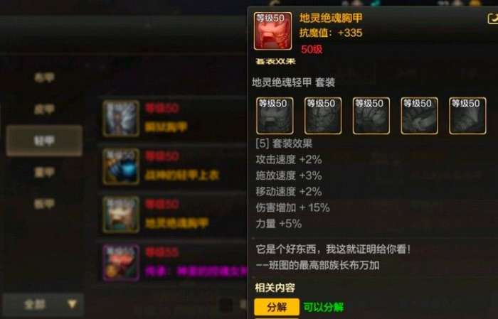 可以为角色提供了大量的基础属性,作为55级套装也增加了大量的本职业装备类型精通奖励,套装有一个进去地下城的祝福+6%的三速。