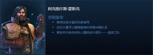 蒙斯克可征召帝国劳工和冲锋队,为他的统治前赴后继。蒙斯克使用的资源不是能量,而是“天命皇权”,训练和升级皇家卫队都会产生天命皇权。此外,蒙斯克帝国见证者还会广播激励士气的消息,让冲锋队员对蒙斯克忠心耿耿,同时产生更多的天命皇权。随着天命皇权的不断积累,蒙斯克还能使用更加强大而富有争议的技能。在需要的时候,蒙斯克可以对敌人施放“核弹天劫”,让战场沐浴在核弹之中,将一切化为灰烬。