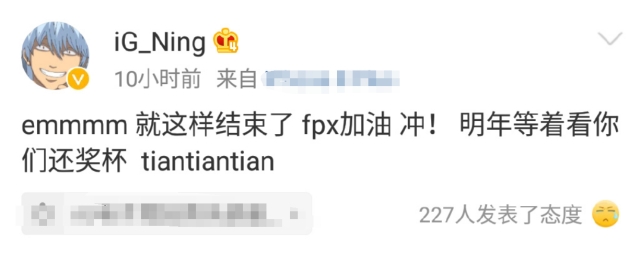 而宁王在输掉了比赛之后,也发送了一条微博。表示FPX冲冲冲,并且在后还发送了三个Tian,看来宁王确实觉得小天是一个很强大的对手呀。阿水也希望FPX能够加油,同时也告诉自己来年再战!就让我们一起期待明年的IG吧!