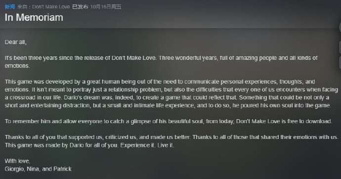 【Steam上这款螳螂恋爱游戏转为免费 纪念已逝开发者】于2017年在Steam上发售的螳螂恋爱游戏《Don‘t Make Love》今日起转为免费,本作开发者之一Dario在今年7月因癌症不幸去世,官方希望更多的玩家能够透过这款游戏感受到Dario在其中倾注的灵魂。