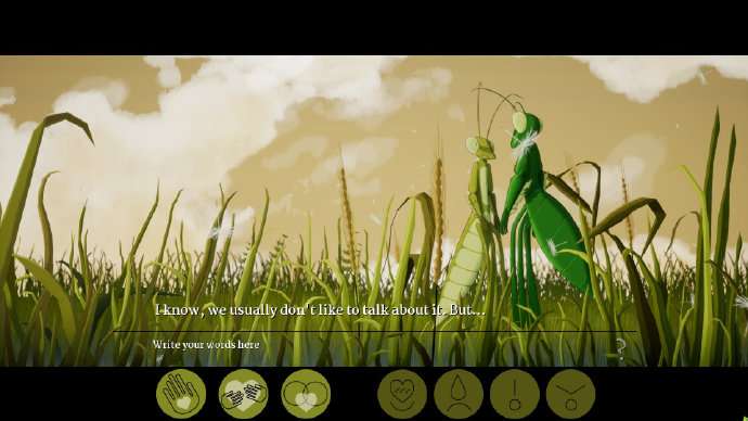 在这款游戏中,玩家们将体验到螳螂夫妻所面临的困境。游戏中的一对螳螂夫妻正在繁衍的本能(交配就可能导致雄性螳螂死亡)和彼此的爱情之间取舍两难,如今它们也将要做出决定。玩家们可以输入内容,回应自己在游戏中的伴侣,通过对话也将改变螳螂夫妇的生活。
