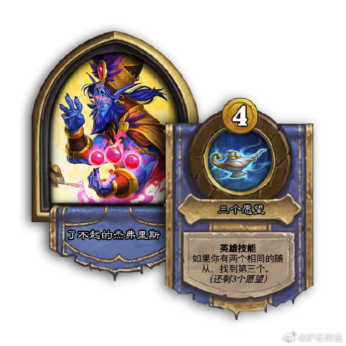 技能: 三个愿望[消耗4枚铸币]:如果你有两个相同的随从,找到第三个。(还剩3个愿望)