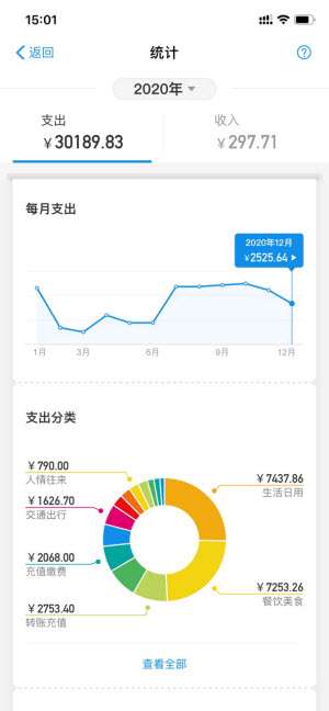 3、选择年账单模式,然后选择2020年就可以查看全年的账单情况了!