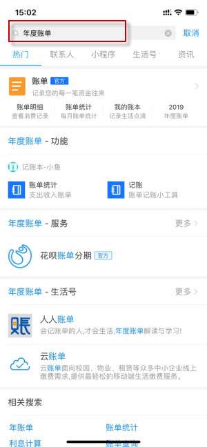 1、首先打开支付宝首页,在顶端的搜索栏中搜索年度账单,点击进入账单页面