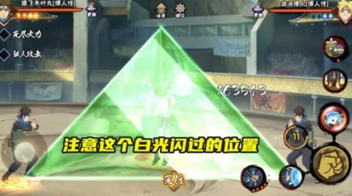 接下来再说一下我对于博人传木叶丸的看法,最近一直有玩家说博人传木叶丸太难打了,简直是一个阴间忍者,三方封印的范围这么大,而且也完全看出来哪个是本体,哪个是分身,就更没办法先手了。其实,快速找出博人传木叶丸三方封印的真身有个小技巧,就是通过三方封印的闪光方向来快速区分,各位可以看下图,如果这个三方封印的白光从左侧往右边亮,那他的本体就会在左边,而如果白光是从右边往左边亮,那他的本体就会在右侧。