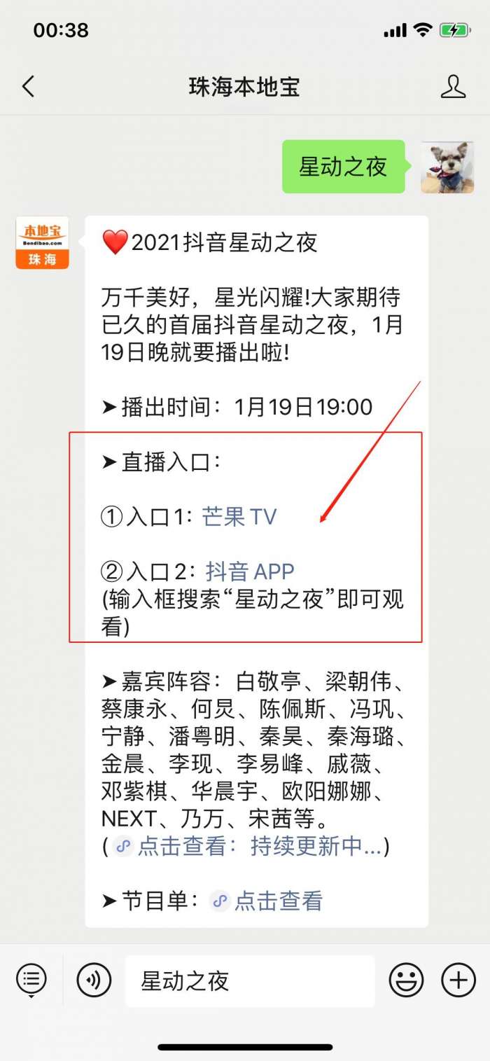 微信搜索公众号 珠海本地宝 (ID:zhuhbdb),关注后在对话框:回复【星动之夜】,即可获取2021抖音星动之夜播出时间,直播观看入口,明星嘉宾阵容名单(持续更新中...),完整版节目单等;以及结束后的完整版视频回放入口等。回复【风险】获取全国疫情风险等级查询入口(实时更新)等。