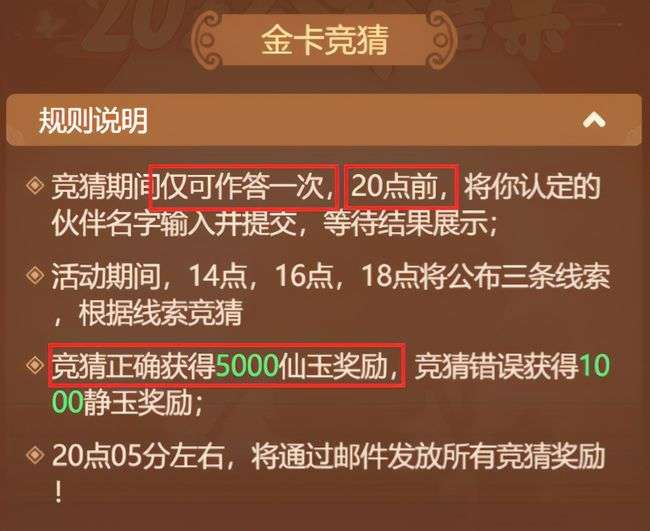 小编第一时间点了进去,看了眼规则:绿色显眼的5000仙玉竞猜奖励一秒就把小编吸引住了。竞猜正确5000仙玉,竞猜错误1000静玉,简直一个天上一个地下。