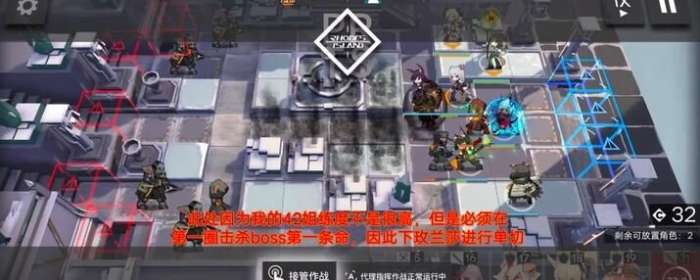 如果没有成功击杀boss第一条命,则等待,期间部署小火龙或同类的术士进行清怪,再部署群奶吸引仇恨保护小火龙,在情掉小怪,boss准备开始绕圈的时候部署梅兰莎等剑圣近卫将boss最后一丝血条清空。