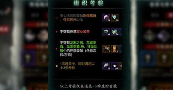 本次更新后,大家可以看到一些关卡会带有组织考验的图标,“组织考验”对通关条件提出了各种限制,譬如不穿戴指定装备,心法,或需求穿戴指定装备,心法等。欢迎对自己的实力和技术有自信的玩家前来挑战考验关卡!