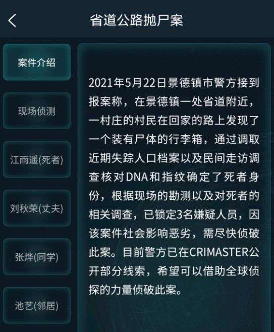 犯罪大师省道公路抛尸案答案是什么?犯罪大师省道公路抛尸案谁是凶手?5月23日更新的最新案件中,这次我们将来到景德镇中,街道报案发现一个装有尸体的行李箱,已经锁定三个嫌疑人,具体案件答案内容下面就来告诉给大家吧,快来看看咯~