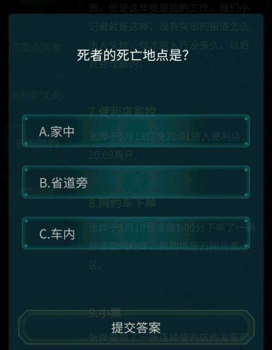 1、死者死亡地点是?A:家中、B:省道旁、C:车内