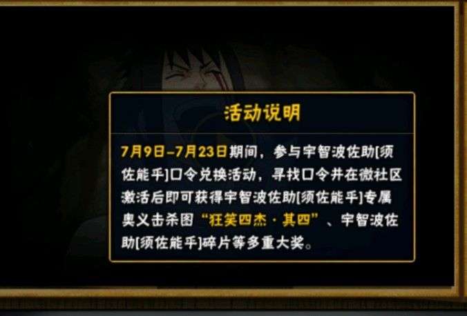活动说明:7.9日—7.23期间,寻找口令并在微社区即可获得宇智波佐助专属奥义击杀图、碎片等大奖,游戏里佐助的专属活动,找到奥义图,然后点击详情,输入口令就可以了。