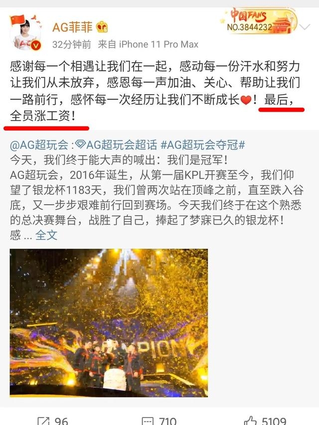 2019KPL秋季赛总决赛中AG超玩会赢了,获得组队以来第一座总冠军奖杯,AG超玩会时隔一千多天通过自己的努力,终于在2019秋季赛总决赛站上了高的领奖台,他们是棒的,赛后AG超玩会老板菲菲也非常高兴地声称“全员涨工资”。