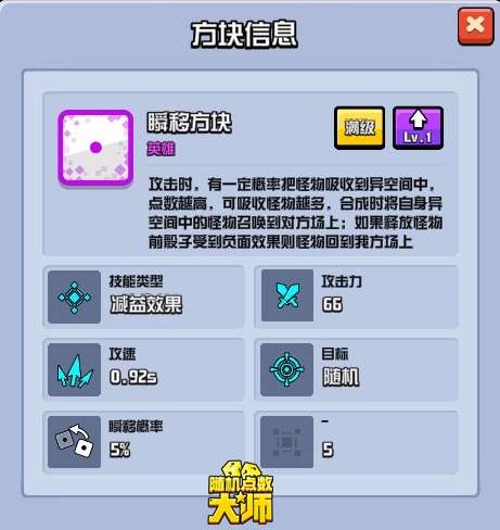 技能特点:瞬移方块点数越高,可吸收的怪物越多。合成时能够将自身异空间中的怪物召唤到敌方战场上;如果释放怪物前骰子受到负面效果的影响,怪物则会回到我方战场上。