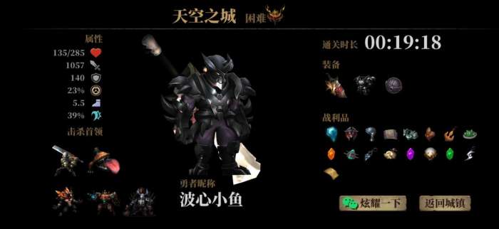 攻击流:恶魔皮肤+远古方石/钢铁巨锤/诅咒之刃武器+漆黑战甲+大嘴魔怪和狂战士宝石+跳跳球副武。攻击流主要用于刷图,第一关先把食物打出来不要捡,然后找个怪把血打到1/3以下再开始吃肉(因为后面可能会捡到陨石碎片,所以压血线压到1/3以下最佳)。遇到铁匠必升级,遇到商人必买肉,遇到加攻道具必捡,遵循这个规律,正常到第二个首领打完就是600+攻,小怪一个连招带走。
