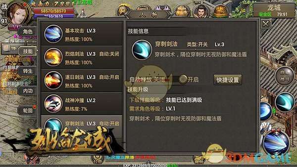 战士的技能非常实用,包括弧月斩、穿刺剑法、战神冲撞、烈焰剑法、逐日剑法。弧月斩施展出来形似弯月,可以攻击周身的数个敌人!烈焰剑法可以使剑上带有火焰魔法,对敌人造成火焰伤害!逐日剑法可以使烈焰攻击长度增加,一队敌人不在话下!战神冲撞可以撞开比自己等级低的敌人,乃是集追杀、逃跑、打乱阵型三合一的神技!