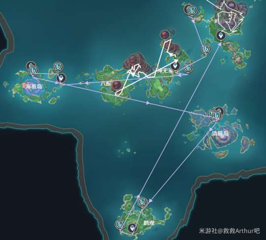 路段1,3,5,6,8分别为蒙德,璃月,稻妻,须弥,枫丹境内钓鱼点