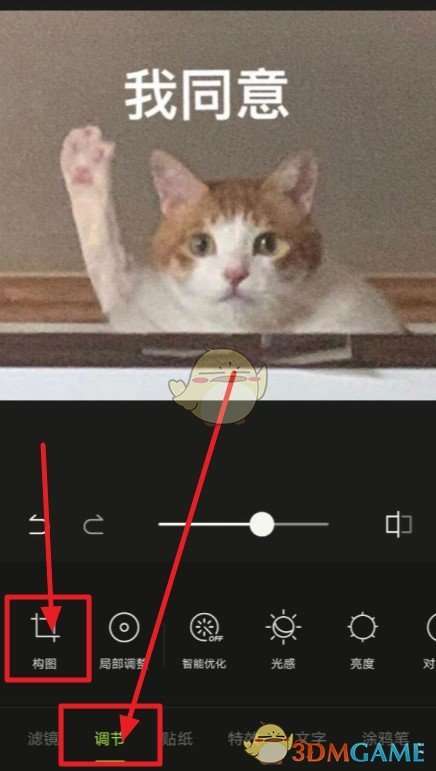 1、先在醒图导入需要调整的图片,点击下方菜单中的【调节】选项,选择第一个功能【构图】。