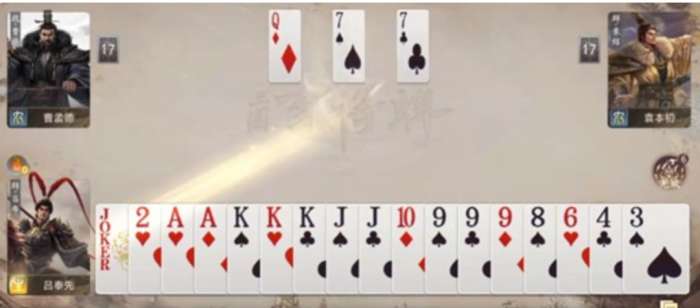 虎牢关第四关难度进一步提升,吕布初始手牌中J、Q、K占比显著增高,威胁等级上升。此时应优先选用具备稳定压制能力的牌型接招,再考虑是否动用大牌资源。值得注意的是,2与大小王不属于J/Q/K范畴,因此可作为安全压制手段反复使用。若局势趋于失控,即便持有小炸弹也应暂缓使用,以防因强行压制失败导致牌权易手,反而助其回收高价值牌组。通过精准判断出牌序列与牌型搭配,在关键节点降低其怒气获取效率,从而掌控整体战局走向。