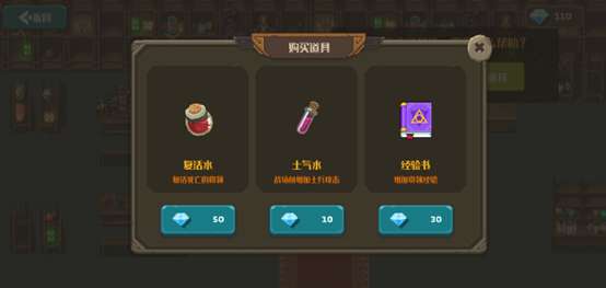 目前设计有三种道具可以通过宝石购买,分别为:复活水,士气水,经验书。