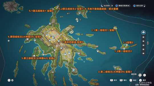 纳塔5.2共有5组铭文,每组两个,收集齐后跳天地万象隐藏成就「烬火重燃」,如下图所示。