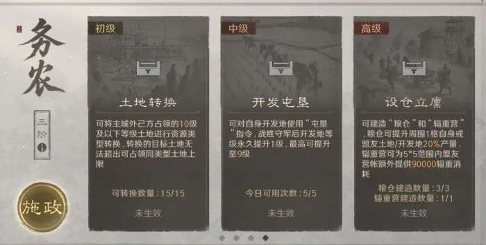 开荒阶段推荐优先启用“务农”方略。第一阶段可对城外土地实施类型转换,建议结合资源克制关系择优攻占,再执行转换操作;石料资源因产出效率与建设需求匹配度高,应列为首选转换目标。第二阶段可集中资源将8级开发土地升级至9级,此为提升初期资源产能的关键路径。