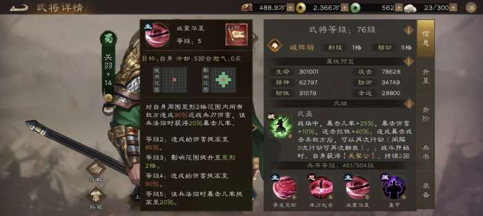 历史之魂:此技能名直指其神兵“青龙偃月刀”。向前突进3格,是“过五关斩六将”千里寻兄、一往无前、冲破一切艰难险阻的生动写照。而对单目标100%必暴的设定,则是将“斩颜良”这一其个人武勇的巅峰时刻神圣化、技能化。它向玩家宣告:任何敢于单独挑战武圣的敌人,都将重现颜良的结局。