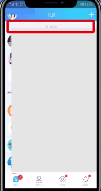 1、打开手机QQ,选择最顶上的“搜索”,红框标注的位置就是了,