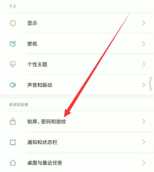 2.在设置界面,点击锁屏、密码和指纹进入此选项。