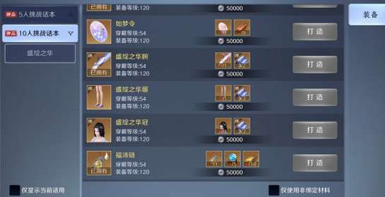 打造系统如图所示,这里我们把第一套金装称为T1套,第二套金装称为T2套,以此类推,T2套打造需要T1套同部位的装备为原料。主材料是挑战本掉落(每个boss保底掉落2个材料,每个boss打完后翻牌子可以获得0到4个材料不等,纯看脸),不同部位需要的主材料种类和数量均不同,而首饰打造需要额外的辅材料——影金,在胜负令商店兑换,每件首饰需要10个影金,也就是1W2胜负令,而每周胜负令获取周上限才2W,所以平民打造非常缓慢。
