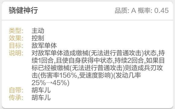 然后是对敌军单体造成一回合的缴械。 这个控制只有一个目标而且才一回合!我不禁吐槽,***效果也太差了点吧?基本上放不放都差不多,如果对面法师队的话就真的是白放。