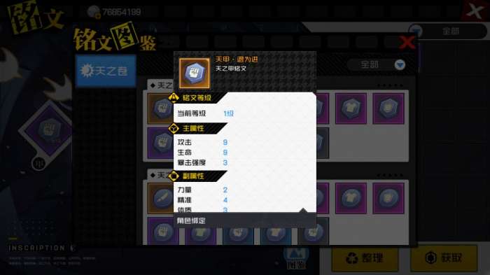 铭文的属性加成分为主属性和副属性加成。相同品阶的铭文,其主属性加成完全相同,副属性根据铭文图案的不同,会附加不同的属性加成。例如,刀形铭文附加的属性为力量、精准、爆伤强度等,提升角色的攻击能力。盾形铭文附加体质、抵挡、防护等属性,提升角色的防御能力。