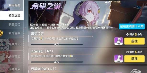 暴雨将至 主线活动十六章主线活动[暴雨将至]将在5月28日 04:00结束,[长空云巢]、[封锁地带]玩法将关闭,[长空之忆]活动商店也会关闭,请及时兑换活动奖励。