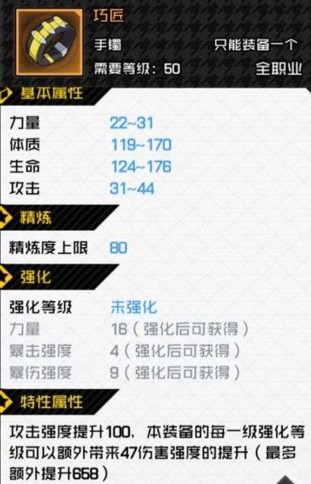 《巧匠》/手镯适合所有角色使用。增伤强(强化14有7.58%增伤),十分稳定,需要较高的强化度(强化+14)。