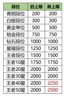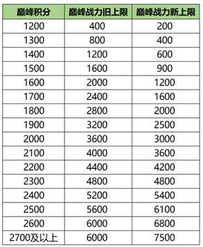 1、调整了巅峰赛各分段所能获取的荣耀战力上限分布(改动如图所示),目标是减少在巅峰前中期对应分段时,打满上限所需的场次,使玩家更聚焦于巅峰积分的提升。