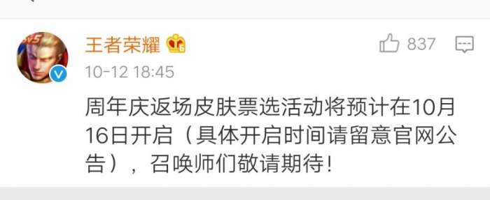 王者荣耀五周年限定皮肤返场投票活动开始时间: