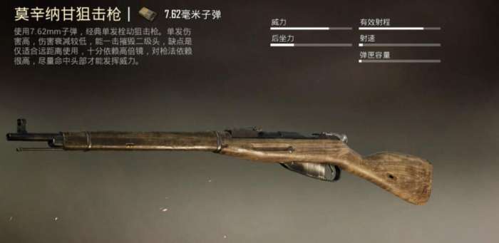 莫辛纳甘是一把经典的栓动狙击枪,使用的是7.62mm子弹,可以装配高倍镜,具有射程远、单发伤害高的特点,并且会在海岛、雪地地图中刷新。