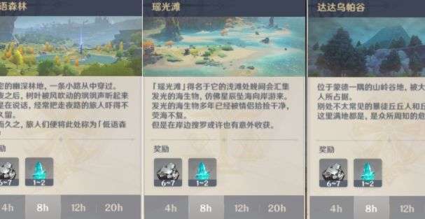 于是乎,我这里推荐下版本想要囤够矿石资源,但是不想挖矿的旅行者在「派遣探索」中选择8小时委托去积累白铁矿。也可以选择4小时的委托同时积累黑铁矿和白铁矿。