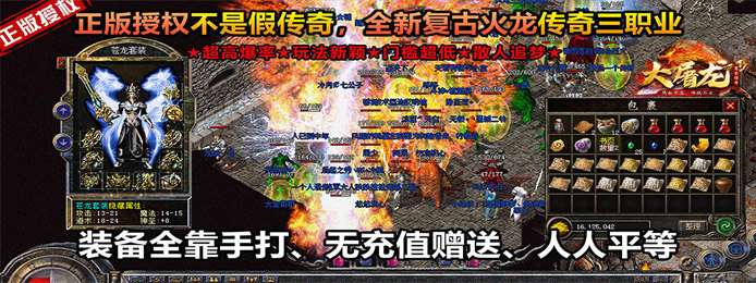 《大屠龙(复古传奇)》是一款真正的复古三职业传奇手游,沿用了经典的传奇登录界面,完美复现了昔日的战法道三大经典职业,郑重承诺游戏内不卖装备、元宝靠打、自由交易、一键回收,带你回到往昔那个热血攻沙的青葱岁月!