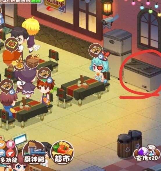 3.如何查看背包内通过消消乐和做菜宝箱掉落的道具和食材。左上角更多功能里点开冰箱或者直接在店铺里点击冰箱所在的位置即可,第一页为获取的食材,地第二页为获得的道具