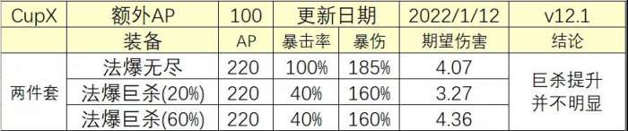 我们取一个6黑法提供100额外AP的常见数值,法爆巨杀和法爆无尽比较起来,即便是触发60%的Buff,法爆+巨杀也不会比法爆+无尽高出特别多,但仅20%的时候还是比较亏的。