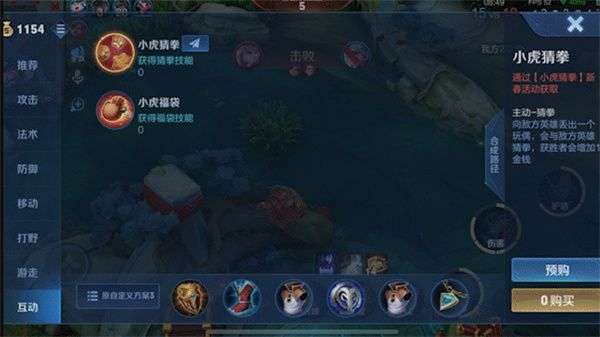 另外玩家们也可以去商店互动,在这里也有小虎猜拳和小虎福袋,两种获取方法都可以让玩家们轻松的获得新春活动的道具。使用小虎猜拳的方法也特别的简单,在游戏开局之后,玩家们会发现在活动期间内游戏界面多了一个按钮,是一个猜拳的按钮,玩家对局的时候想要使用小虎猜拳道具可以直接点击这个按钮。