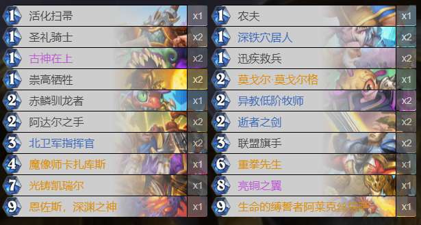 1费:活化扫帚x1、农夫x1、圣礼骑士x2、深铁穴居人x2、古神在上x2、迅疾救兵x2、崇高牺牲x2
