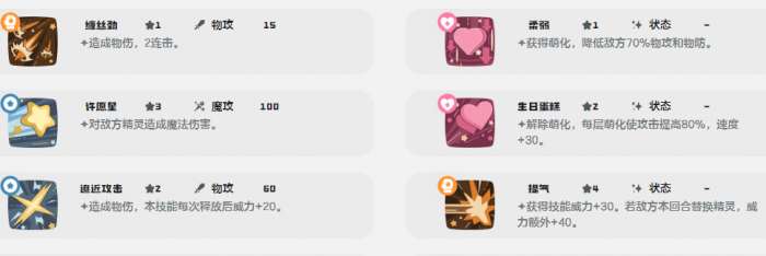 休息回复就可以直接回30%的血,作用于日常还是足够的。更厉害的是还有一个应激反应,普通的情况下大概就可以回25%的血,要是遇到对手防御反击,那就可以直接回80%的血。残血反打,那全部都需要靠他。另外还有一个赤子之心,不仅可以回40%的血,而且还可以获得6点能量。整体的性价比还是比较出色的,除此之外增益技能也是主要的亮点。柔弱可以把敌方的物理性攻击还有物理性防御直接下降70%就可以给我方创造出更多的机会。