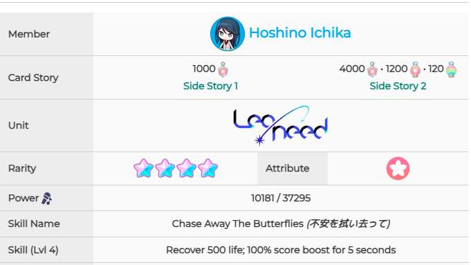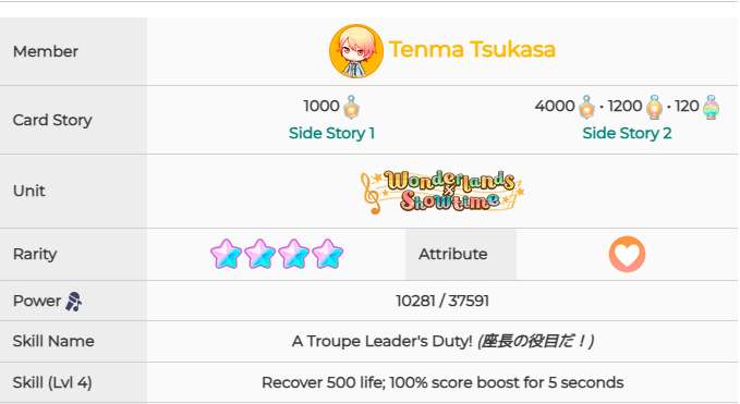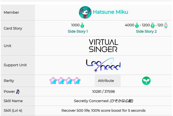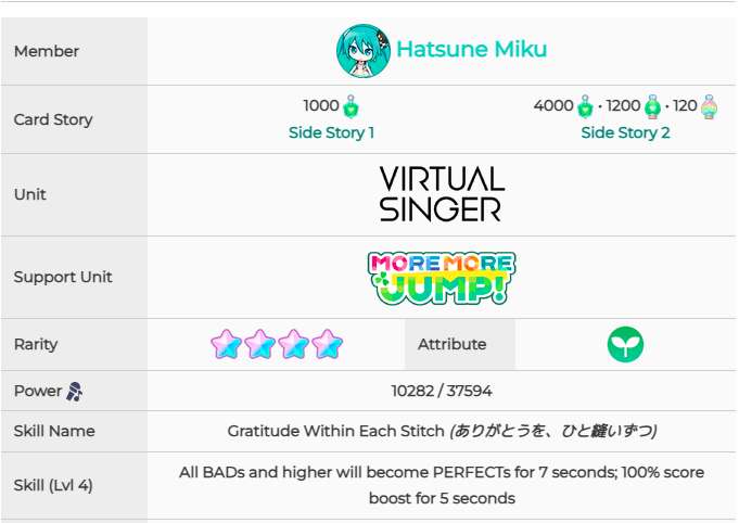 训练前 训练后 技能:回血500,5秒得分100% 2、带你看看世界的换衣间]初音未来 训练前 训练后 技能:改判7秒,5秒得分100% 3、[强者的笑容]初音未来 训练前 训练后 技能:5秒得分120% 4、[为大家加油吧!]初音未来 训练前 训练后 技能:5秒得分130%(仅对perfct有效) 5、[被剪断的线]初音未来 训练前 训练后 技能:5秒得分130%(仅对perfct有效) 6、[黎明前的倾诉]星乃一歌 训练前 训练后 技能:回血500,5秒得分100% 7、[哎呀呀呀呀?!]花里实乃理 训练前 训练后 技能:改判7秒,5秒得分100% 8、[再次与你并肩]小豆泽心羽 训练前 训练后 技能:改判7秒,5秒得分100% 9、[担惊受怕?!落荒而逃!]天马司 训练前 训练后 技能:回血500,5秒得分100% 10、[栩栩如生]宵崎奏 训练前 训练后 技能:5秒得分120%以上就是pk游戏网小编整理带来的初音未来缤纷舞台全4星卡属性怎么样,全4星卡面和技能一览,更多相关游戏攻略,请关注pk游戏网!