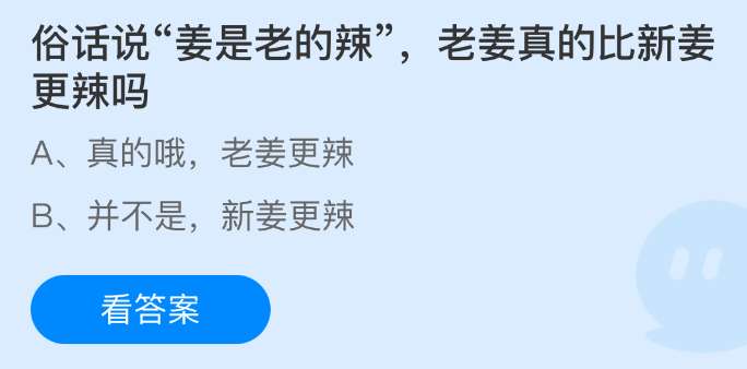俗话说“姜是老的辣”,老姜真的比新姜更辣吗?支付宝小鸡课堂开课啦!每天花一分钟答题赚饲料,喂喂小鸡就能贡献爱心啦!轻松又意义十足!2025年12月30日蚂蚁庄园的小鸡课堂题目正确答案是【真的哦,老姜更辣】,老姜的姜辣素类化合物相对含量通常高于新姜。