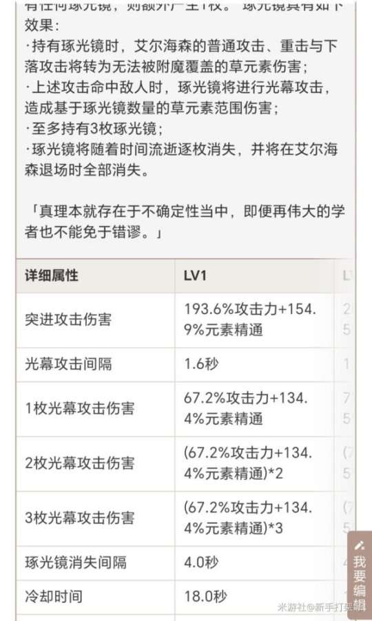 艾尔海森普攻伤害并不高,主要依赖琢光镜输出,拥有琢光镜期间普通攻击获得无法覆盖的草元素附魔。拥有琢光镜期间尽量使角色打出最后一段普通攻击。