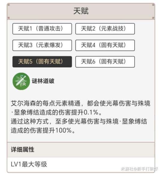 每点元素精通使光幕伤害与Q(元素爆发)的伤害提升0.1%,达到最大值100%需要艾尔海森有1000点精通。元素精通对艾尔海森的提升除了琢光镜造成的光幕伤害外,还有元素反应带来的伤害,1000点精通产生的草原核造成伤害大约是3倍,而造成的燃烧、激化伤害也是原来的一倍,涉及到破水盾、雷盾时,造成的元素反应伤害收益还要高。