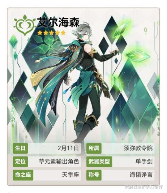 艾尔海森比较依赖元素反应打出伤害,需要一个持续挂元素的角色挂元素,艾尔海森打出草元素进行元素反应,如果生成草原核需要进一步的配合,打出超激化与超绽放的效果。艾尔海森退场时琢光镜会消失,一般队伍中要一个草元素组成双草阵容,一个水元素的持续挂水与一个雷元素奶妈。