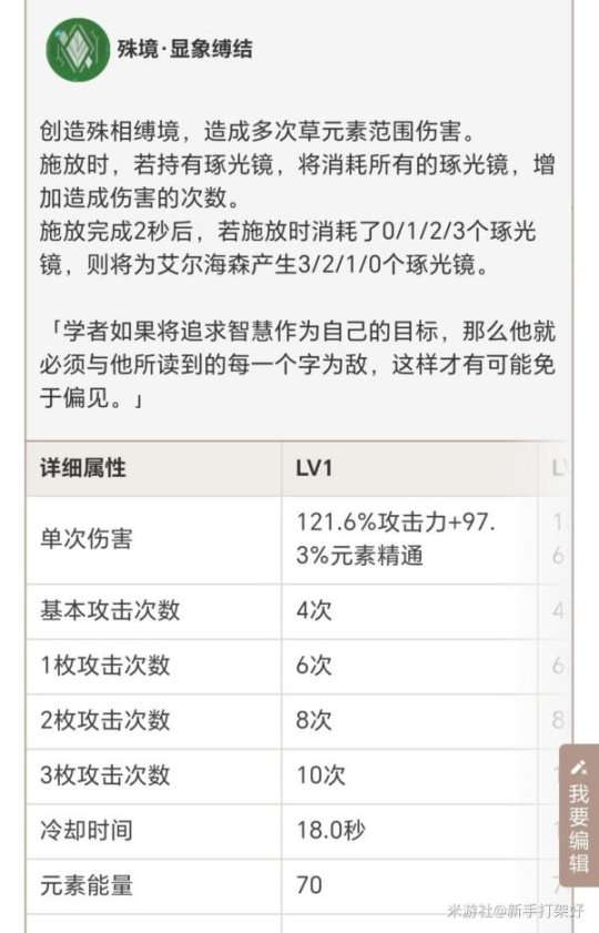 元素爆发Q即是艾尔海森的爆发伤害,也是产生琢光镜的方式。通过消耗多枚琢光镜的方式造成的草元素伤害会更高,三枚琢光镜可以攻击十次,消耗三枚琢光镜达到快速爆发的伤害。殊相缚境产生的的琢光镜与殊相缚境消耗的琢光镜相加为三,E技能起手,Q技能爆发,重击,会产生两枚琢光镜。